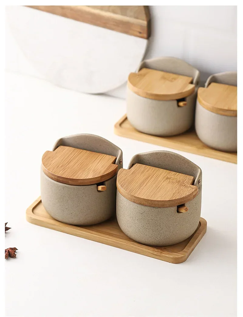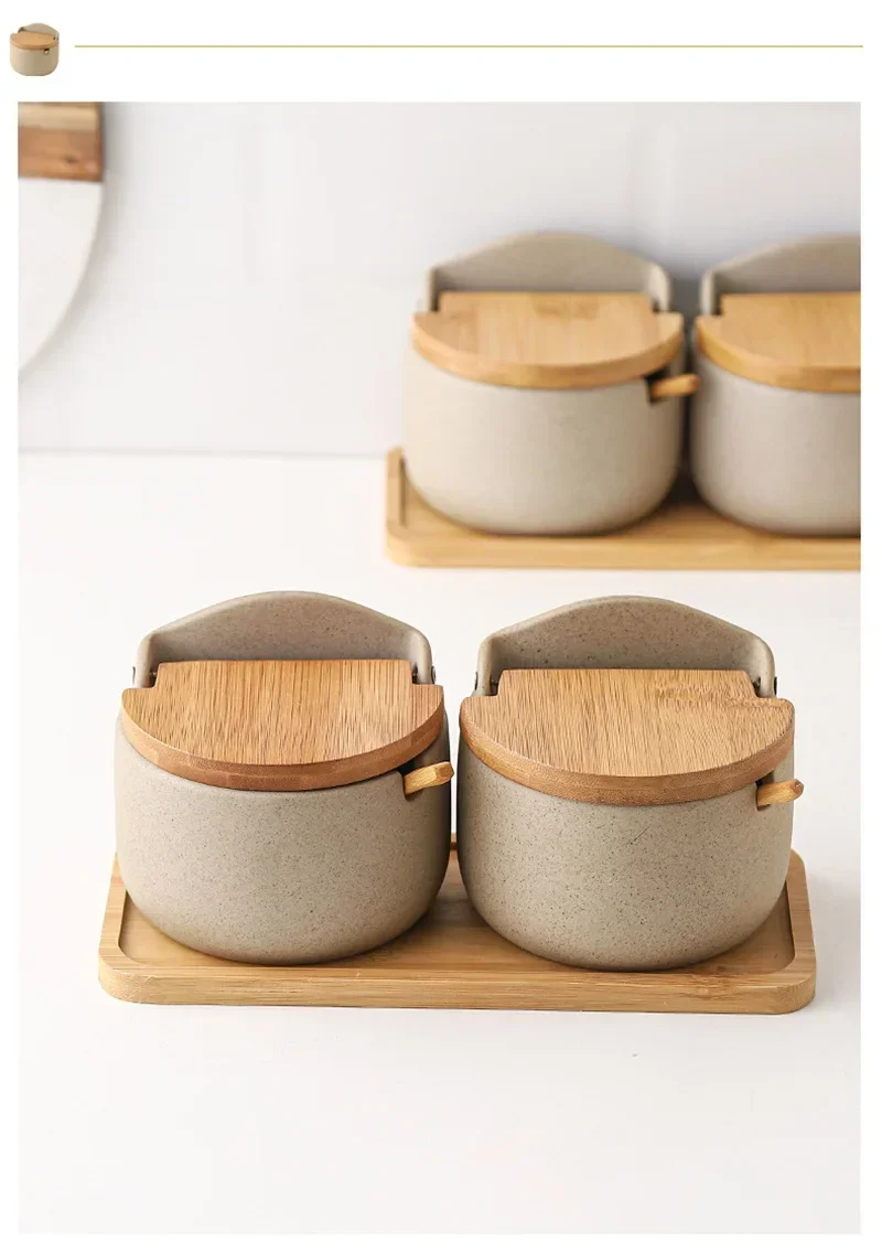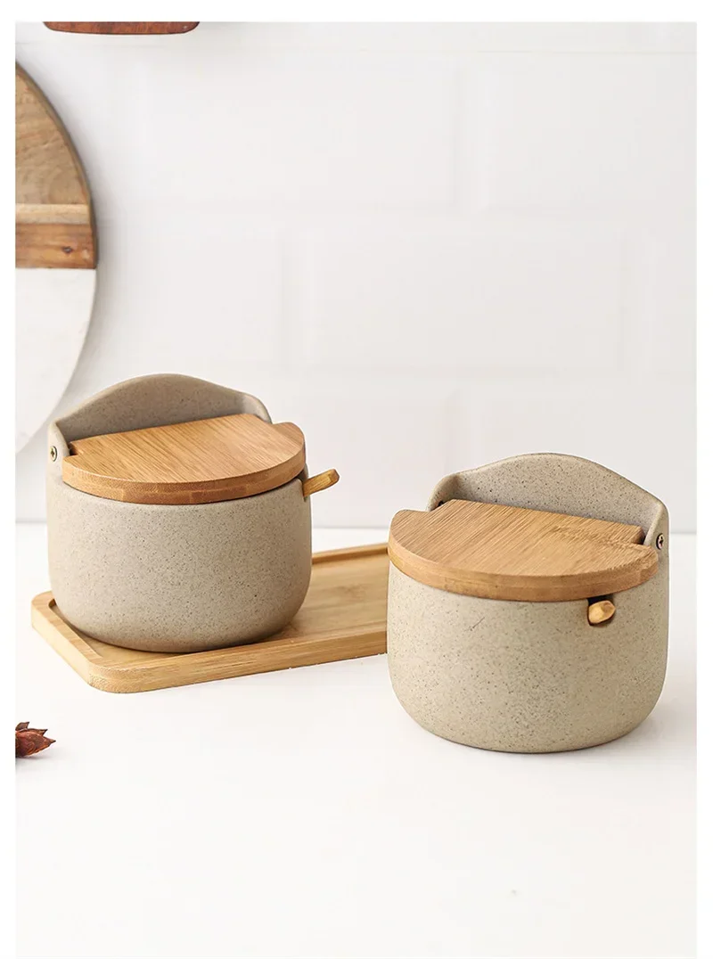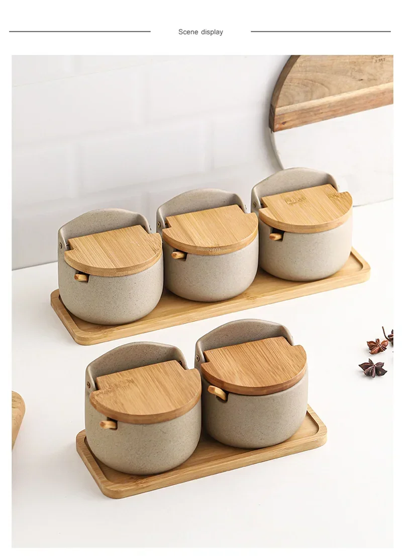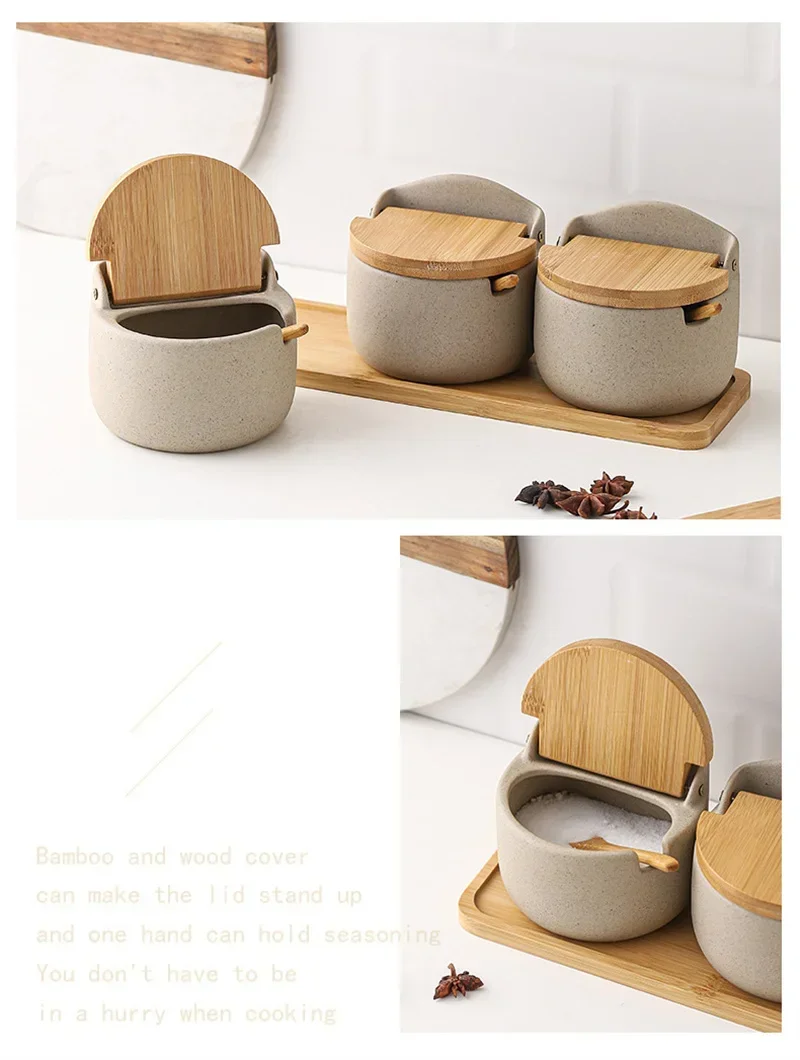 Japanese Style Ceramic Seasoning Jar With Spoon Bamboo lid Spice jar Kitchen Sugar Salt Spices Storage Box Household Container